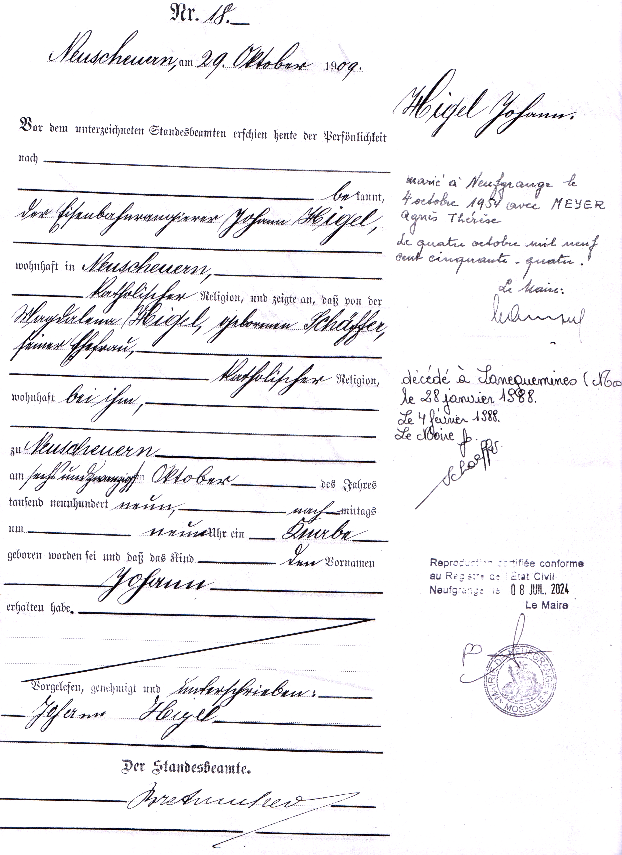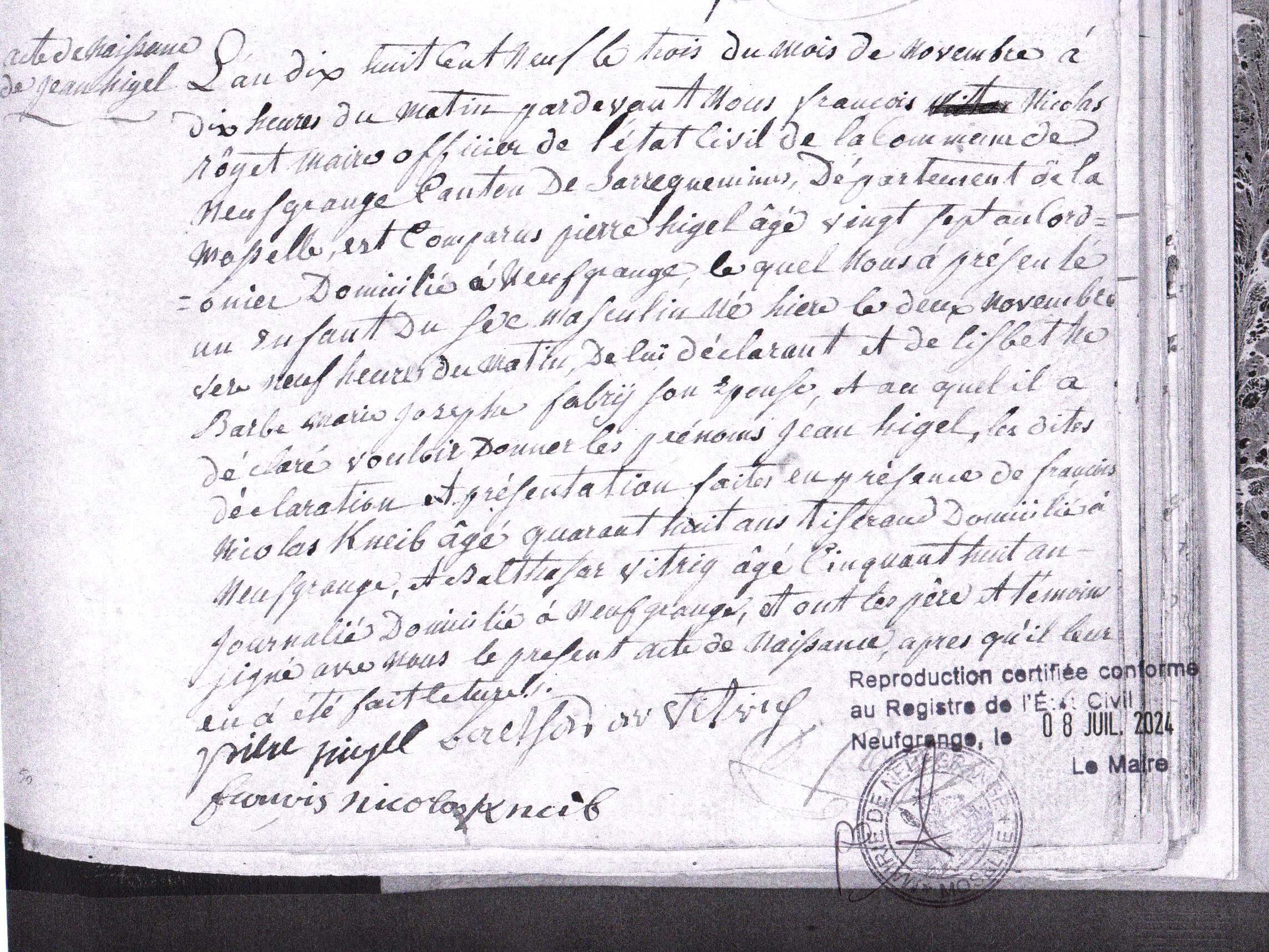 - Extrait acte de naissance Higel Jean né en 1809