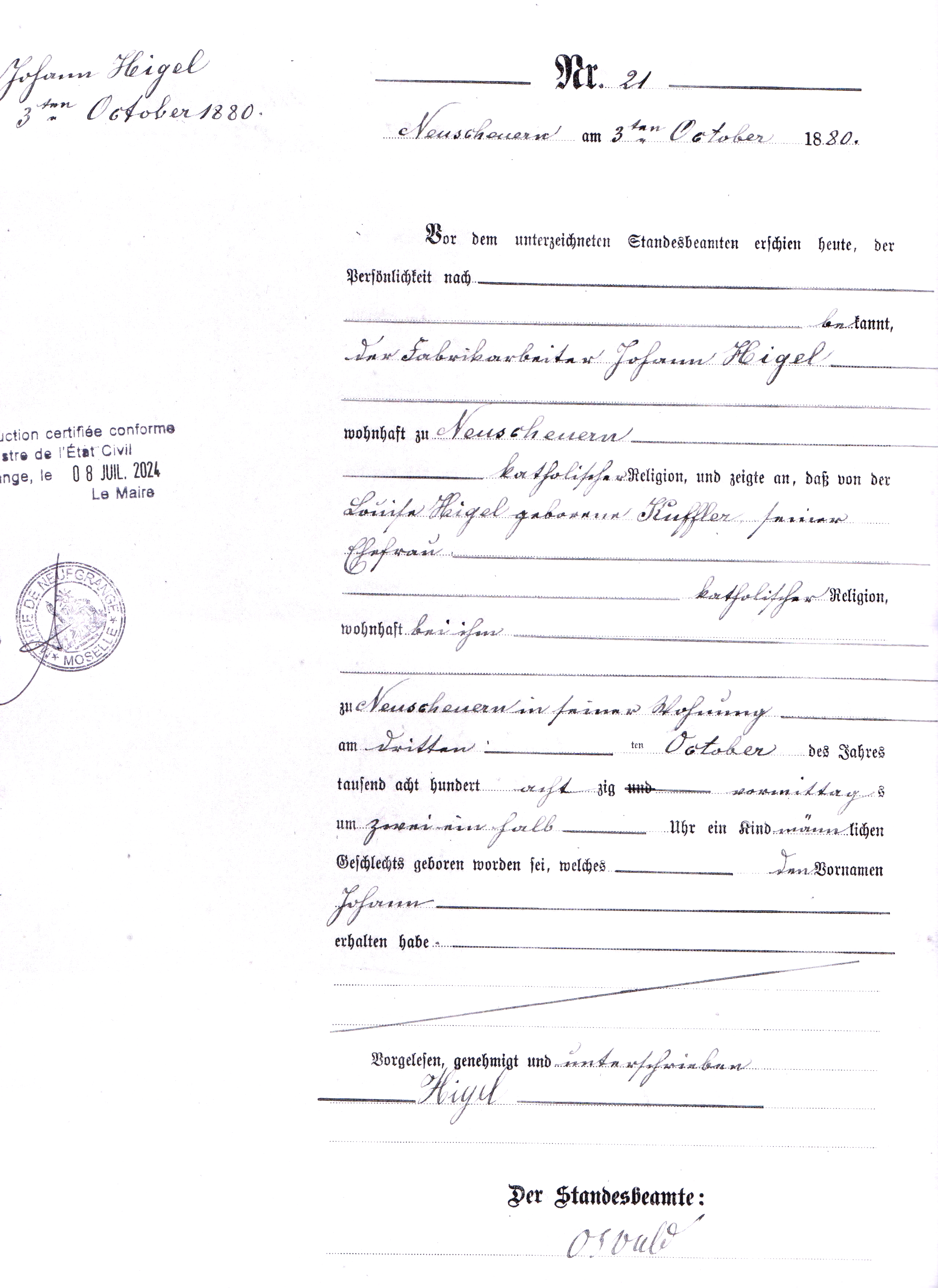- Extrait acte de naissance Higel Jean né en 1880