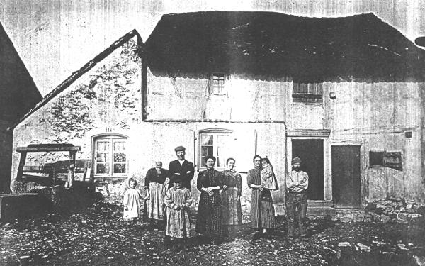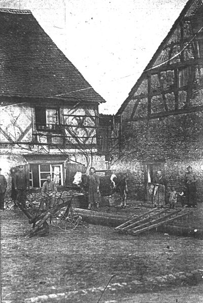 La maison natale de Louise lors de l'occupation en 1917. La vieille grand-mère sur la droite est sa mère et les 2 enfants sont Lucien et Marcel |